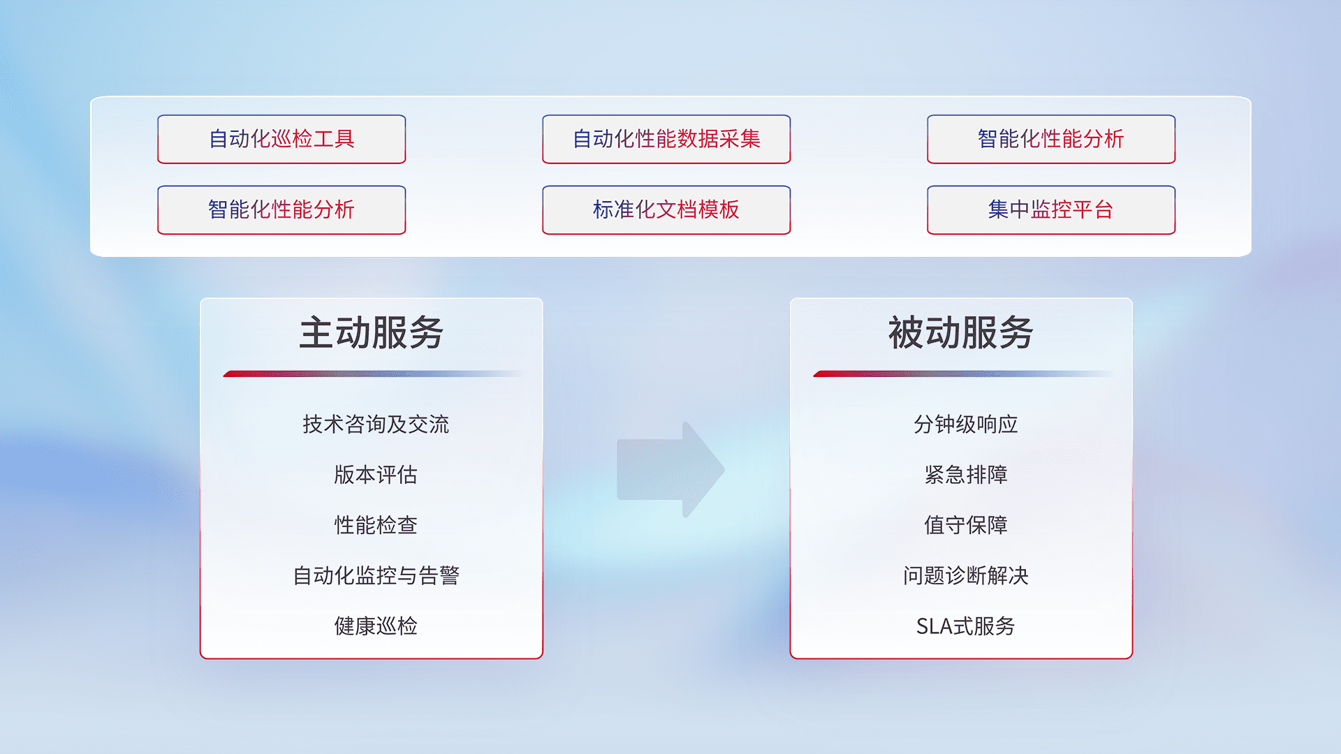 智能化工具和标准化文档,,,,保障服务质量,,提供主动服务(包含技术咨询、、、版本评估、、、、性能检查、、、自动化监控与告警、、健康巡检)和被动服务包含(分钟级响应、、、、紧急排障、、、、值守保障、、、问题诊断解决、、、SLA服务)。。。
