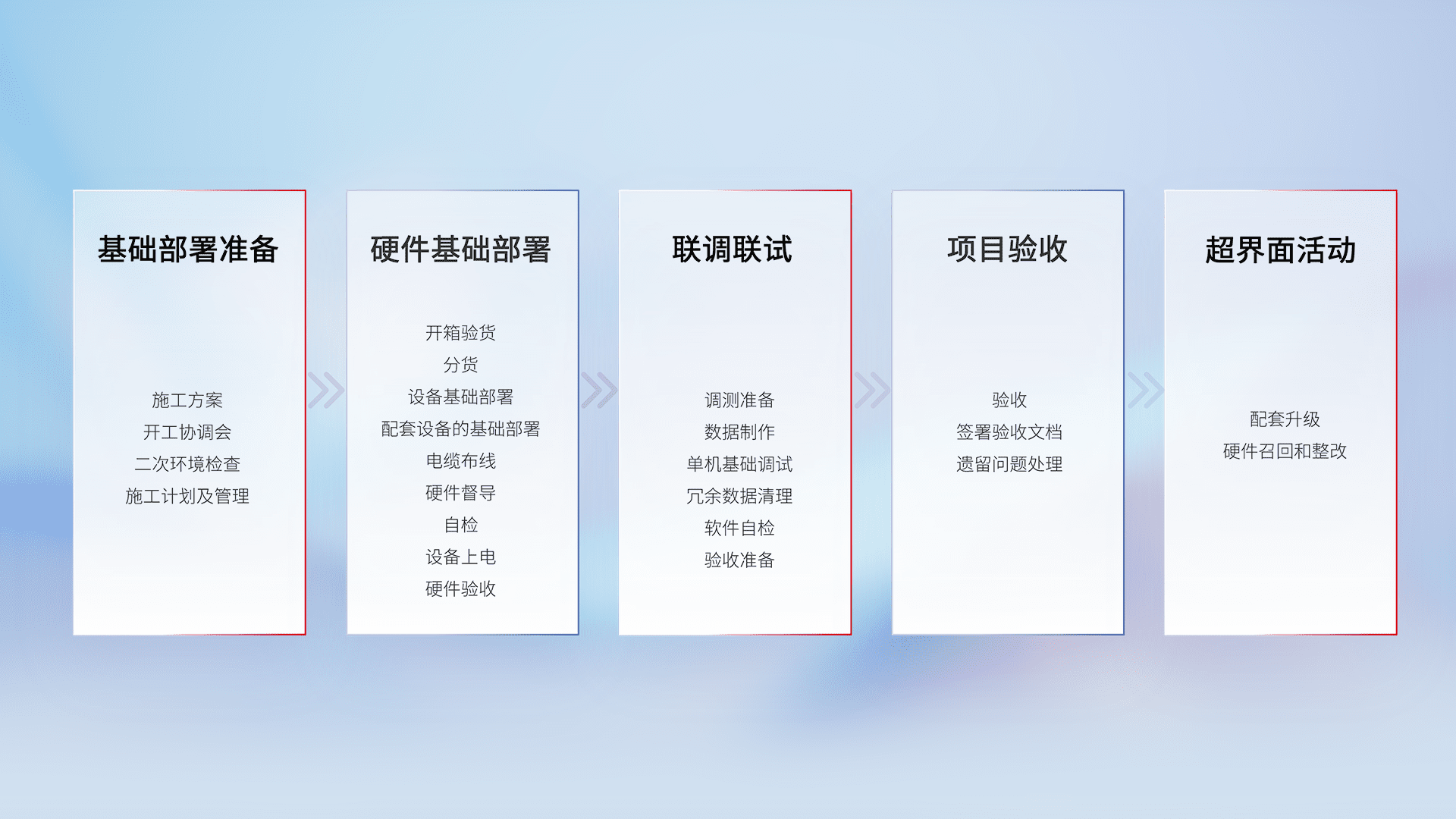 从基础部署准备、、、硬件基础部署、、联调联试、、、、项目验收、、越界面活动的全过程可追溯,,,保证施工质量和进度。。。