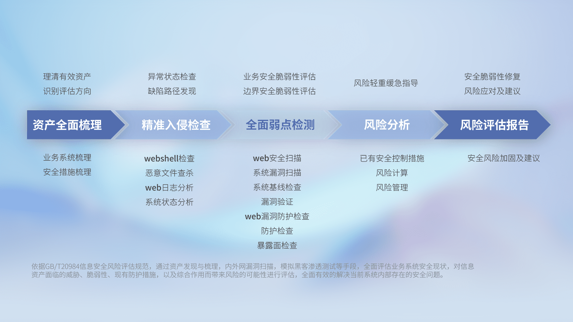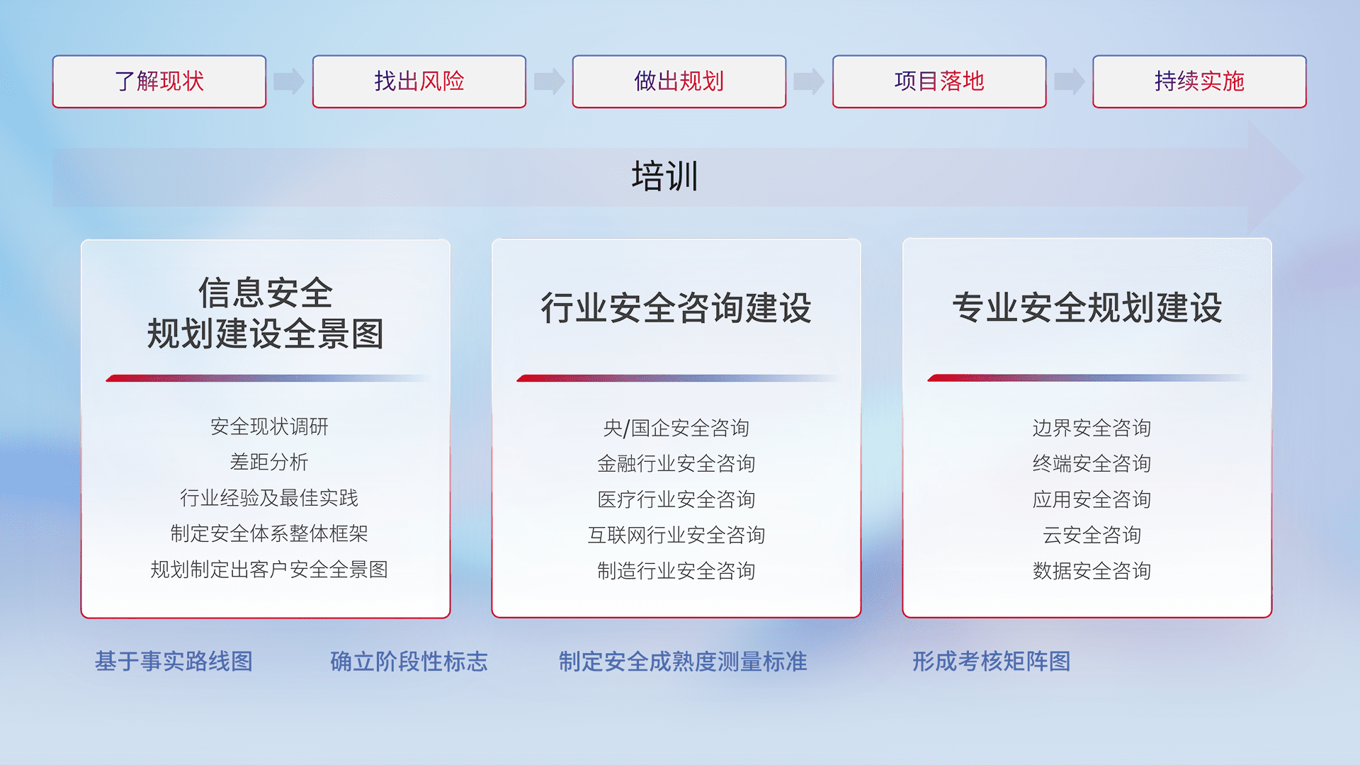 针对客户行业特性,,,以专业的安全服务+多厂商联合解决方案提供专属的一站式安全管理服务,,帮助客户全面感知网络空间威胁,,,,基于识别、、检测、、、分析、、防护、、、、监测、、、响应的服务理论模型,,,从方案咨询、、、、集成交付、、、评估验证、、优化加固、、、运维运营,,,,致力于为客户提供完整的闭环管理式安全服务。。。。以实战经验为客户打造高抵御风险的安全体系,,帮助客户发现威胁、、、对抗威胁、、、处置威胁,,,,不断积累安全对抗能力,,持续保障数字化安全。。